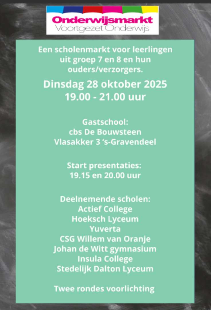 Op dinsdag 28 oktober a.s. wordt weer de traditionele Scholenmarkt VO gehouden in 's-Gravendeel. Ditmaal is het niet De Schelf als gastschool, maar De Bouwsteen, Vlasakker 3.