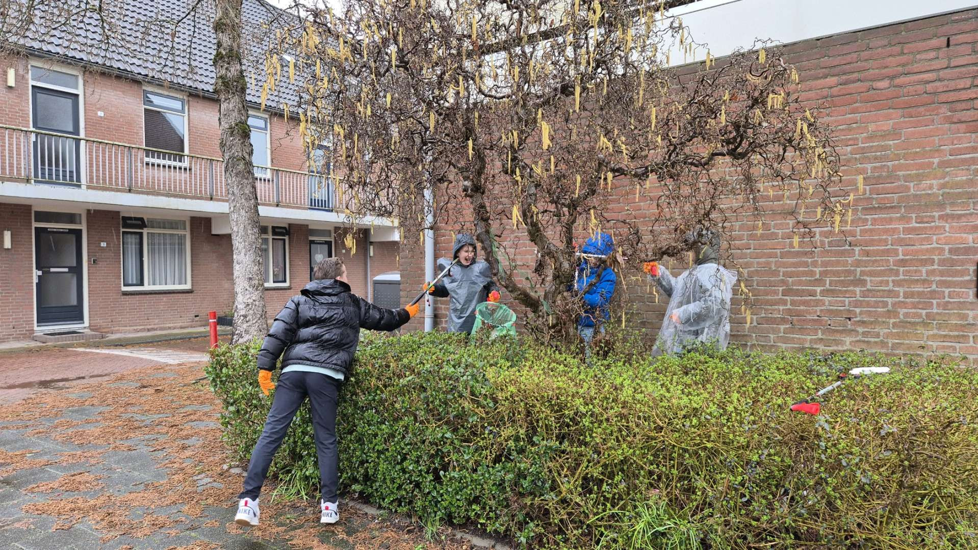 Jonge helden trotseren de regen voor een schone bloemenbuurt
