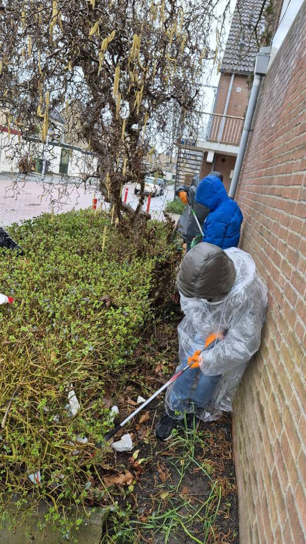 Terwijl de meeste mensen binnen bleven voor het gure weer, trok groep 7 van basisschool De Bouwsteen de regenponcho’s aan. Gewapend met afvalprikkers en een flinke dosis enthousiasme, zetten zij zich in voor NLdoet.